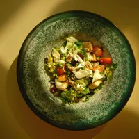 dimljeni losos, mix satala, parmezan, kiseli krastavac, čeri paradajz, campari dresing, kapar
